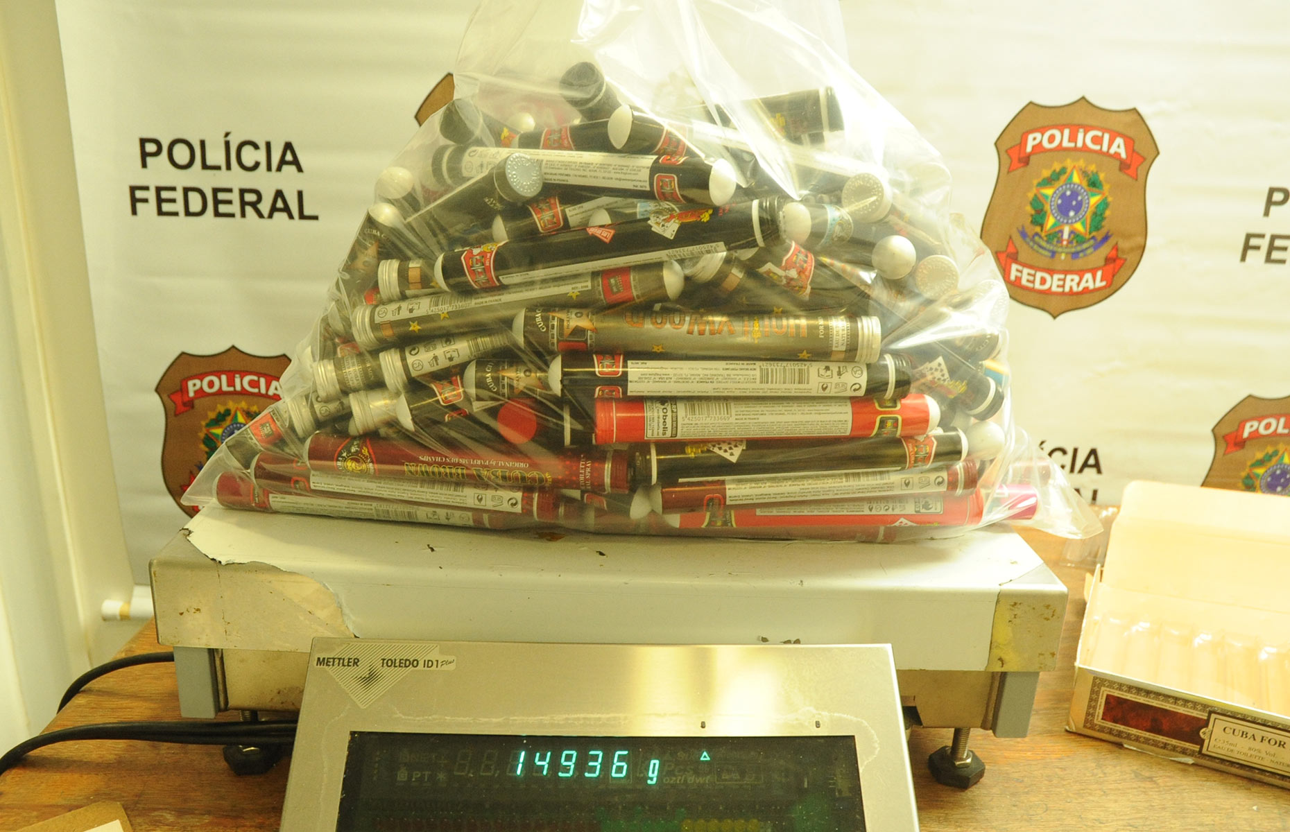 Ali a mulher foi submetida a busca pessoal e revista das bagagens na presença de testemunhas. "Dentro de uma mala foi encontrada grande quantidade de frascos tubulares de perfume que, ao serem perfurados, revelaram conter um pó branco", informou a PF, em nota.